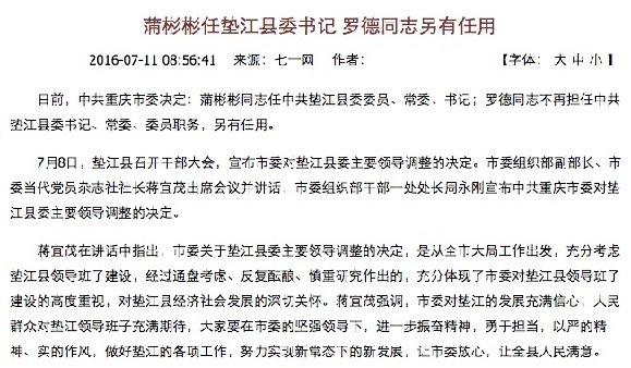 华龙网7月11日9时26分讯(首席记者 黄军)记者刚刚从七一网获悉,日前,中共重庆市委决定:蒲彬彬同志任中共垫江县委委员、常委、书记;罗德同志不再担任中共垫江县委书记、常委、委员职务,另有任用。