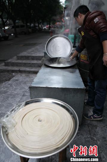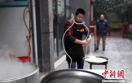重庆一小面馆师傅上演绝活,一根面条50米,一碗面只有一根面。这家“一根面”面馆位于南岸区,只见面馆师傅赵明曦,将面条向天空抛去,面条在空中划出起伏的弧线,最高离地约两三米,最后面条稳稳落入沸腾的大锅灶内。两分钟后,将面捞起,热辣鲜香,劲道十足。 刘渝 摄